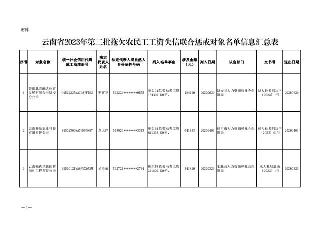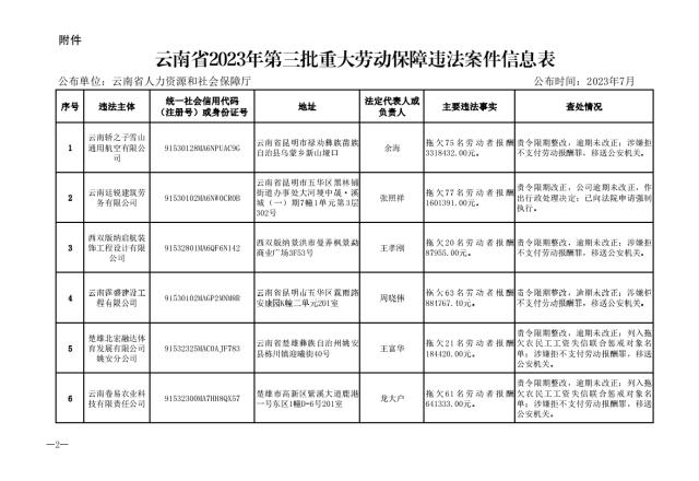云南网讯(记者 杨萍)近日,为加大重大劳动保障违法行为惩戒力度,加强信用监管,强化社会监督,云南省人力资源和社会保障厅向社会公布了2023年第三批重大劳动保障违法案件和2023年第二批拖欠农民工工资失信联合惩戒对象名单。本次公布的重大劳动保障违法案件共6件,涉及6户用人单位;公布的失信联合惩戒对象名单共3条,涉及3户用人单位。