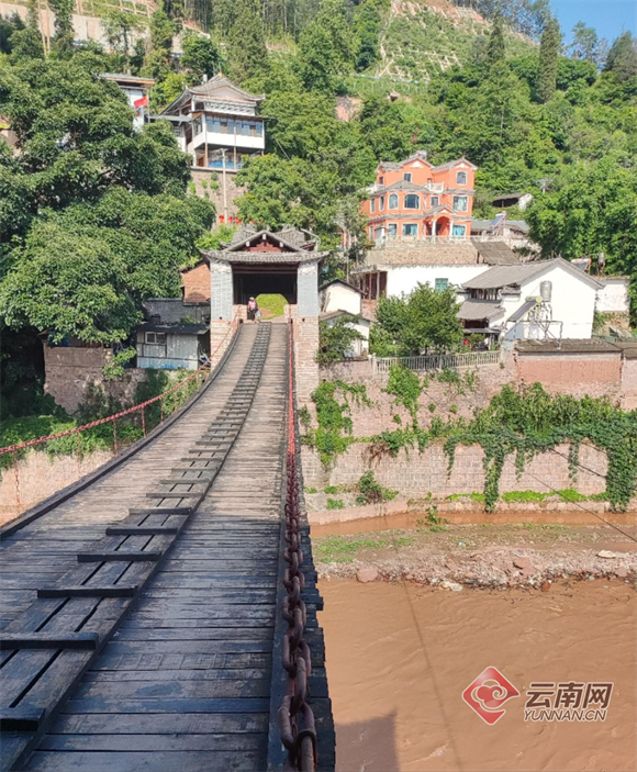 顺着古道,来到云龙桥。这样一条连接漾濞两岸的纽带,在江上,它是博南古道唯一幸存的古铁链吊桥。站在桥边,萧羽笑着说起一个浪漫的传说:人们为了交通方便,在漾江上修建了多座大桥,但都因为江流湍急,山洪暴涨而垮塌;正苦于无法建好大桥时,突然看见苍山上飞起一道彩虹,似一条巨龙,飞跨于漾濞江上,有仙女从彩虹上跨江而过,人们因此得到启示,就在彩虹落下的地方建桥,故而取名“云龙桥”。