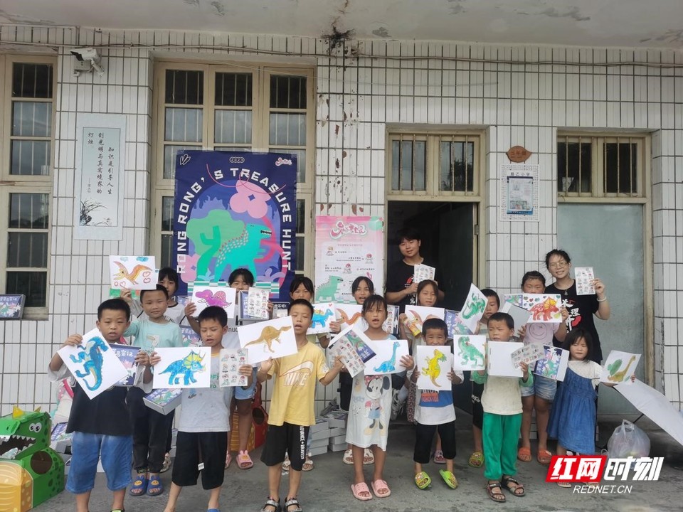 长沙理工大学“好玩的博物馆”乡村儿童美育体验专业实践团用湖南省地质博物馆镇馆之宝恐龙“蓉蓉”搭桥,将国画岩彩画“搬”进了乡村课堂。