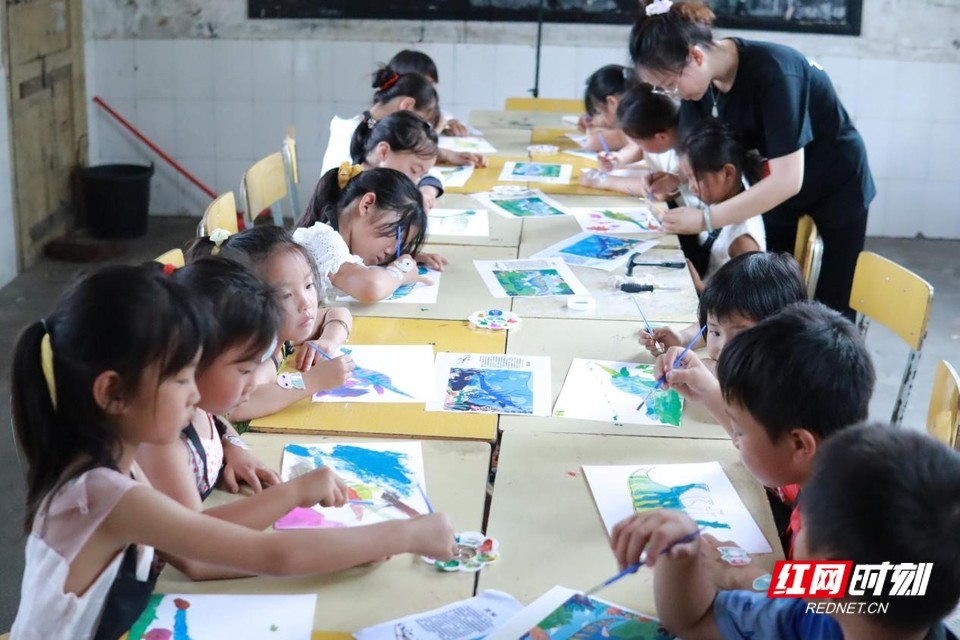 红网时刻新闻7月31日讯(记者 汪衡 通讯员 何兴如)“石头居然可以用来画画!”“老师您看!这是我用岩彩画的恐龙!”近日,在湖南省湘西土家族苗族自治州花垣县夜郎坪村腊乙小学,长沙理工大学“好玩的博物馆”乡村儿童美育体验专业实践团(以下简称“实践团”)用湖南省地质博物馆镇馆之宝恐龙“蓉蓉”搭桥,将国画岩彩画“搬”进了乡村课堂,为山区小朋友们上了一堂别样的地质美育课。