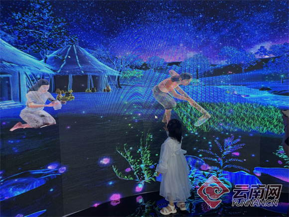 体验厅呈现了云南“远古时期”“古滇幻境”和“南诏余韵”三个主题的九段场景,观众可与“原始人”一同飞鹰走马、钻木取火,通过《南诏德化碑》的时空入口,回到南诏国,感受南诏国王阁罗凤议政的威严,将遇上在礼佛途中的大理国利贞皇帝……
