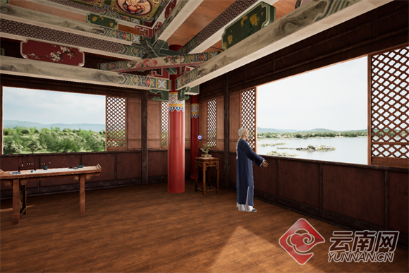 在云南公共文化云展区现场,观众们带上VR眼镜,就可以“穿越时空”,梦回三百年前的大观楼,在“孙髯翁”的指引下,体验“五百里滇池”的壮阔景象,楼里一梁一柱清晰真实,临水而立,树枝摇摆,似微风轻拂,自在逍遥。