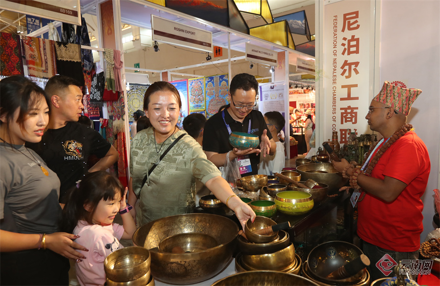 春城市民在南博会南亚馆尼泊尔展区选购特色商品。