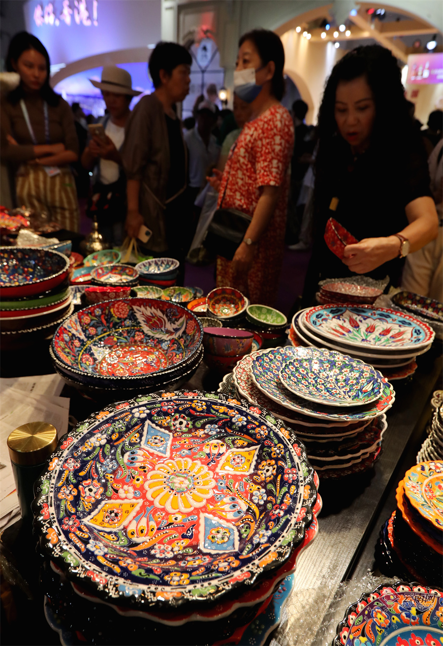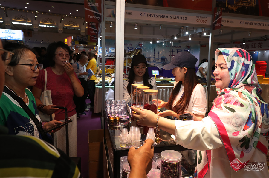 市民在南博会境外馆伊朗展区品尝红花茶饮。