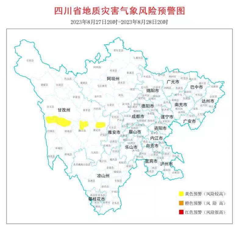四川新闻网-首屏新闻成都8月27日讯(记者 夏婉琳)8月27日,记者从四川省自然资源厅获悉,四川省地质灾害指挥部办公室发布全省地质灾害气象风险预警。据悉,预警时间为8月27日20时至8月28日20时。3级黄色预警,涉及甘孜州康定市、雅江县、白玉县、理塘县、巴塘县等5个县(市)。