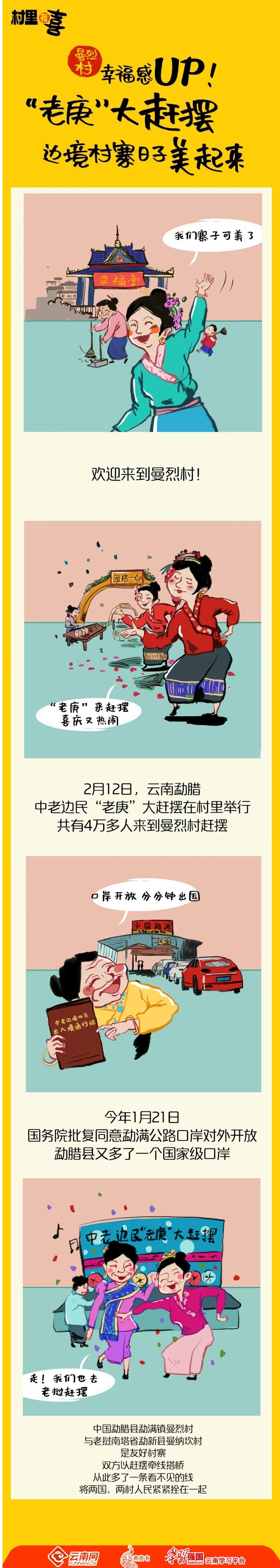 最近,这个美丽的边境村寨喜事连连。今年2月12日,云南勐腊中老边民“老庚”大赶摆在村里举行。“老庚”在傣语里是“亲戚朋友”的意思。当天,4万人相聚曼烈村,当地各族群众以及来自老挝勐新的商贩们在赶摆场上摆摊售货,产品“傣味”十足,“边”色浓郁,现场热闹非凡。