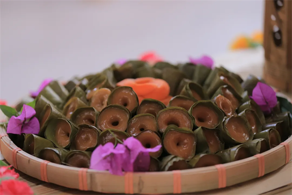 红糖软米粑粑傣语又叫“豪爪”,是傣族赶摆、结婚、农闲时节常做的一道小吃。制作软米粑粑需要经过清洗芭蕉叶、烧水、打米浆,熬煮红糖浆等多个步骤,做好的粑粑外形酷似冰淇淋甜筒。蒸熟后的软米粑粑松软而富有弹性,红糖、软米、芭蕉叶三者的清香巧妙融合在一起,口感细腻,软糯拉丝有嚼劲,是老少皆宜的传统风味小吃。