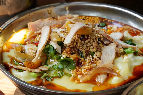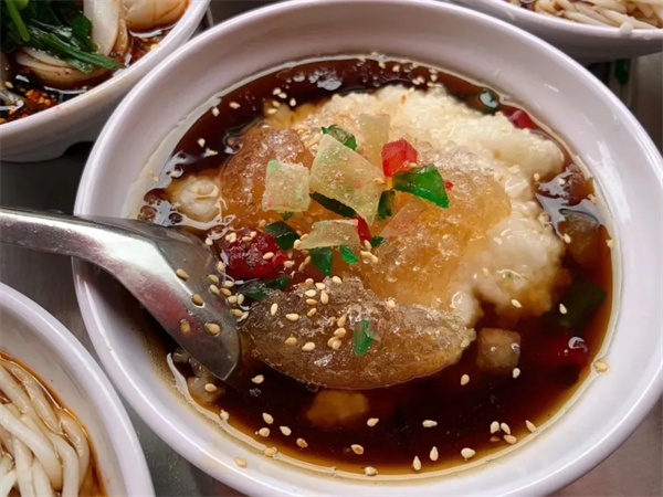稀豆粉一般选用豌豆面制作,制浆要分别制成清浆和浓浆两种,然后再用两种浆制成稀豆粉。稀豆粉的吃法随意,可放入香菜、酱油、辣油、花椒油、酥豆腐水等佐料搭配,麻辣鲜香,随意组合,拌匀后一口下去,唇齿间满是浓郁豆香味。