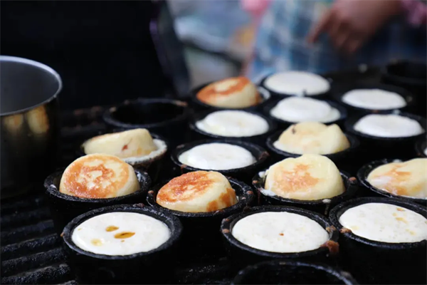 朵朵糕,吃起来外焦里嫩、香软甜口,把糯米漂洗浸水,加入适量的凉米饭后磨成米浆,装在缸里加盖发酵、加糖,待第二天清晨把已发酵的米浆舀到特制的圆形铁铸小容器里,打一个鸡蛋与米浆调匀后进行煎炸。煎炸好的朵朵糕色泽金黄,一口咬下去,外焦里嫩,甜中带酸,米香和油香在舌尖交融。