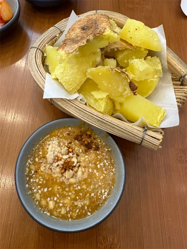 烧洋芋是最普通、最简便,也是最原始的食物。将洋芋自然烤熟,烧到洋芋皮焦黄微煳,热烫而有些许灰皮残余。烧洋芋沙沙软软,热气腾腾,配上丰富的蘸水,吃起来暖暖的。