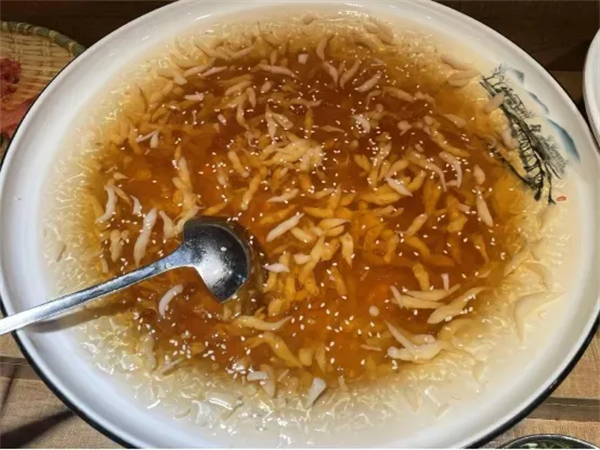 米凉虾由米浆煮熟冷却而成,是云南的风味甜品。它洁白似玉、口感软糯细腻,以白糖熬制的糖稀稀释得到糖水,再加上秘制的玫瑰酱,口味甜蜜、清凉、芳香。