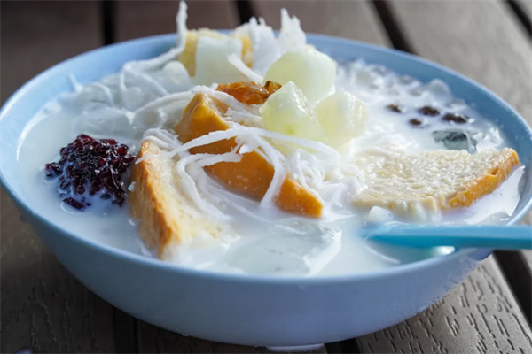 泡鲁达是夏日消暑的绝佳选择,一口喝下去,不甜不腻,椰奶的香味充满整个口腔,被泡着的面包完全被椰奶浸透。吃的时候可以根据个人喜好自由加料,西米、椰丝、面包干,最后放入炼乳和冰块,吃起来冰凉可口,满满都是幸福感。