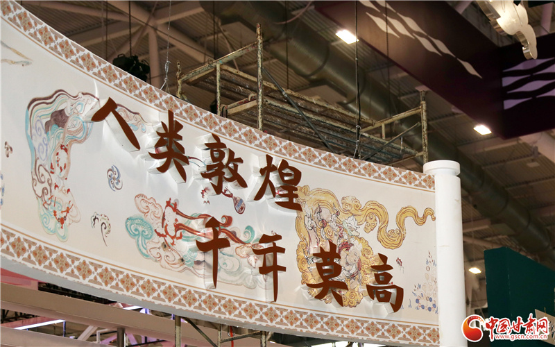 据了解,甘肃主题馆位于文化产业综合展9号馆,展陈面积510平方米,以主线贯穿、特色鲜明、视觉宏观、内容丰富为总体设计宗旨,展馆设计采用敦煌壁画中石绿为主色调,顶部装饰敦煌壁画中藻井图及线条,融入“九色鹿”“飞天”等设计元素,突出甘肃的历史感和雄浑大气。