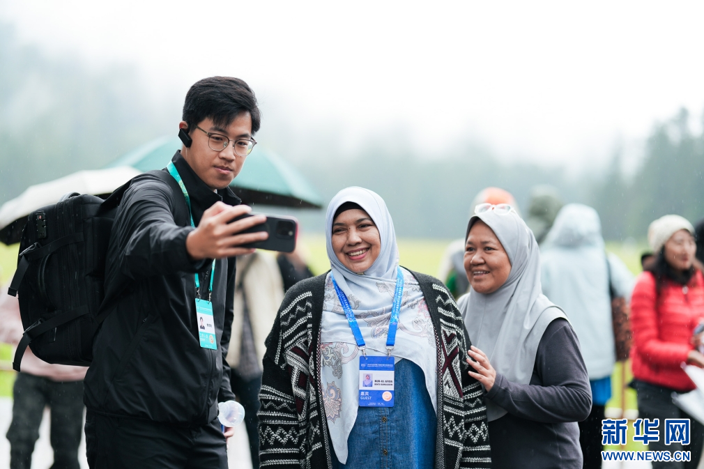 嘉宾在玉龙雪山景区云杉坪自拍(9月8日摄)。新华网发(徐俊 摄)