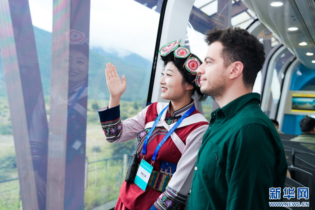 外宾乘坐玉龙雪山索道(9月8日摄)。新华网发(徐俊 摄)