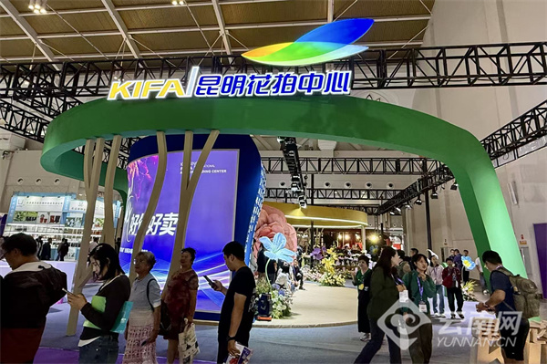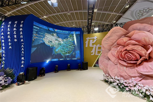 现场,以KIFA标志色系蓝色、黄色为主的两条纽带,从拍卖大钟跨过花海串联到链接全国的KIFA大数据,展示着KIFA在新形势、新业态下,以拍卖交易为核心,配套服务和中心节点城市分市场布局为两翼的全产业链数字化服务平台步伐。以“数字云花”展现,云南建设“世界花园”的美丽窗口。