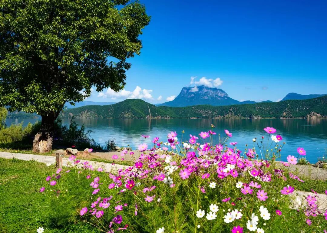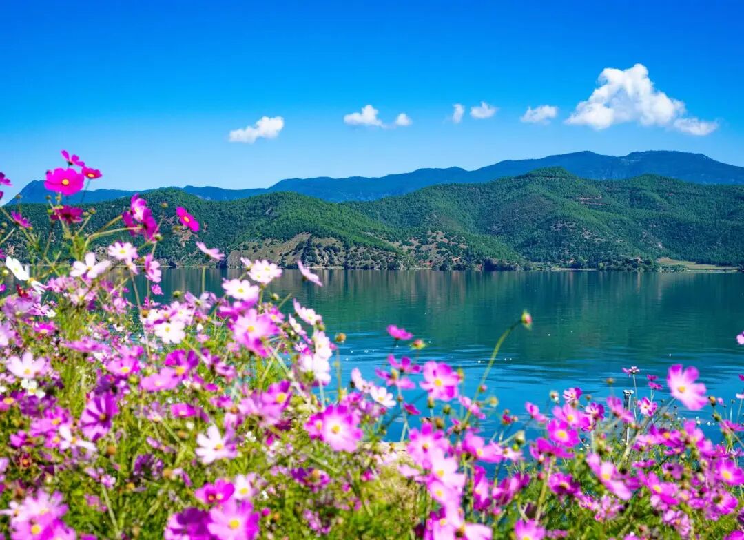 漫步于泸沽湖环湖路,一边是宝石般湛蓝的湖水,一边是绚烂如织的格桑花海。阳光下,粉色、白色、紫色的花朵在风中摇曳生姿,与远方静静守护的格姆女神山、碧空如洗的蓝天和洁白无瑕的云朵构成了一幅动人心魄的绝美画卷。清澈的湖面倒映着山光云影,水天一色,游客们或徜徉花海,或驻足湖畔,纷纷拿出手机和相机,记录下这令人沉醉的瞬间。