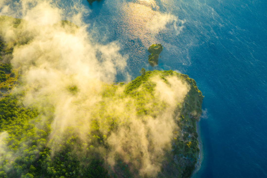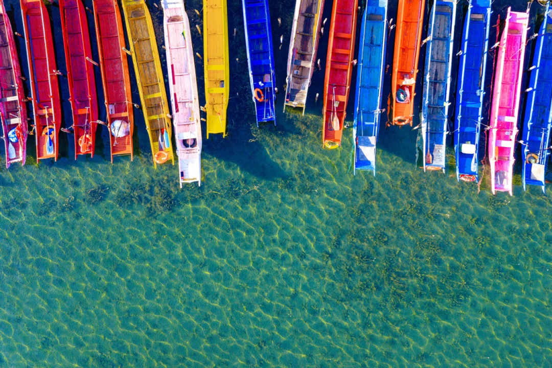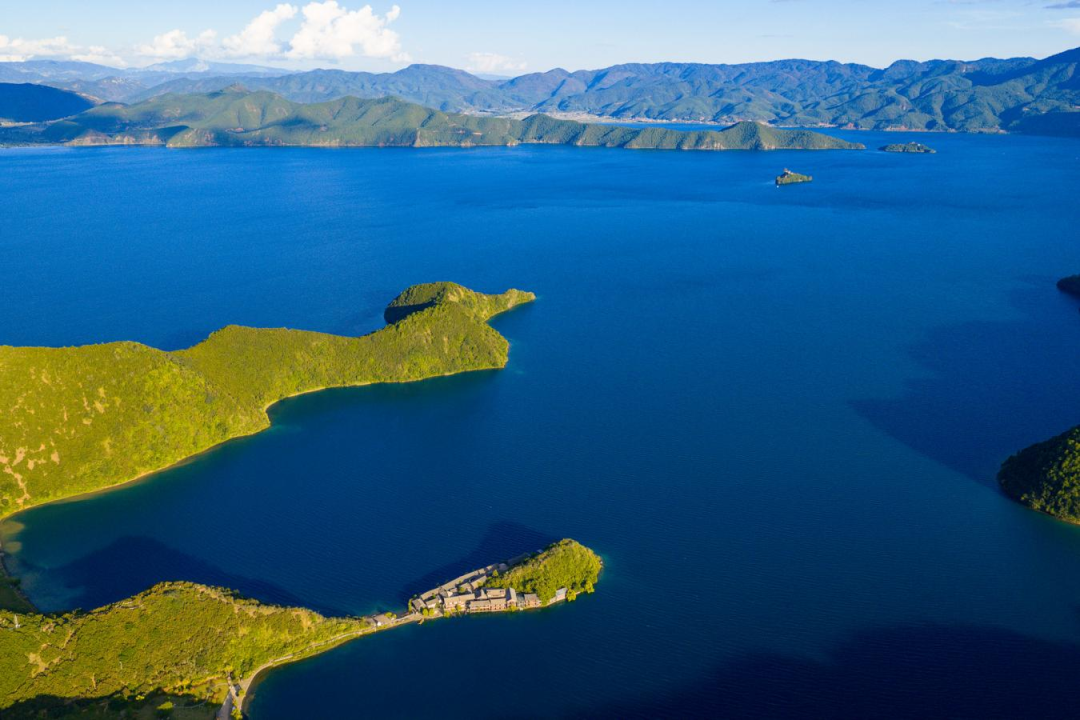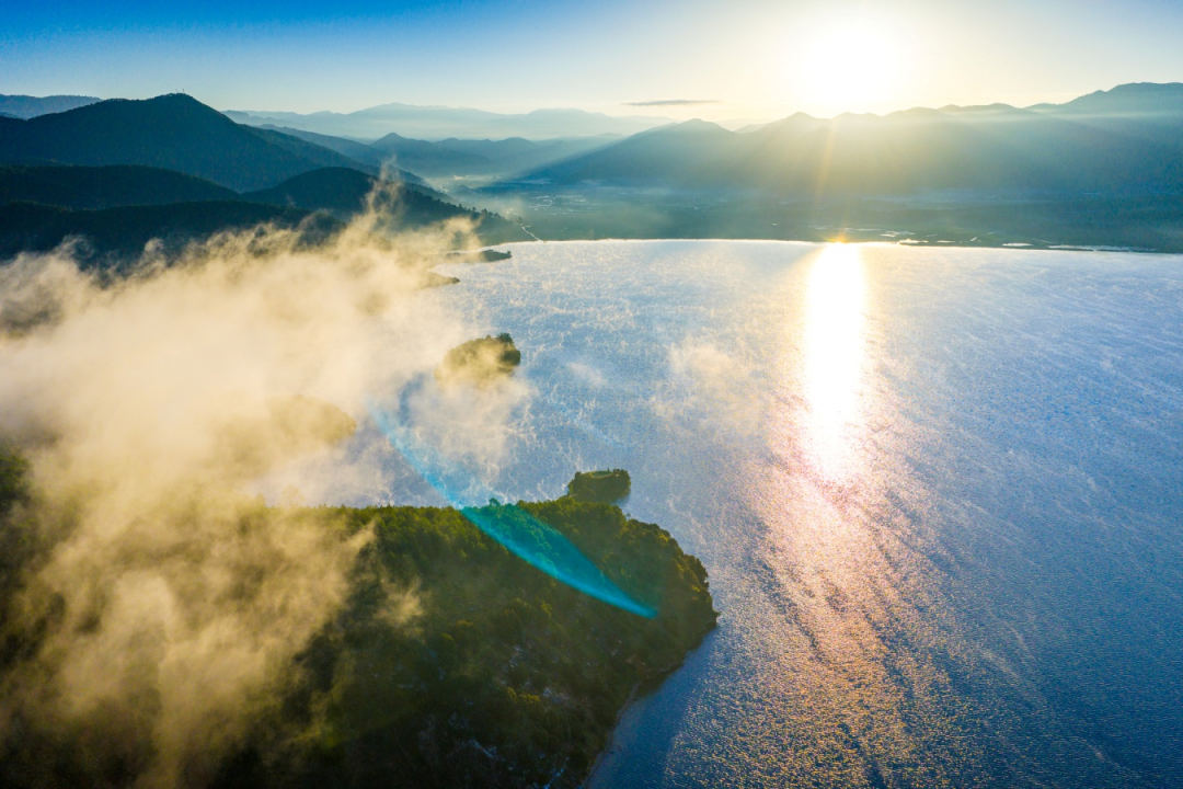 从空中俯瞰,泸沽湖宛如一块巨大的蓝宝石镶嵌在群山之间,蜿蜒的湖岸线勾勒出优美的弧度,而湖畔的花海则像是一条条彩色的锦带,为这颗“蓝宝石”镶上了最亮丽的花边。远处的村落炊烟袅袅,猪槽船在水面轻轻划过,构成了一幅人与自然和谐共生的宁静画面。