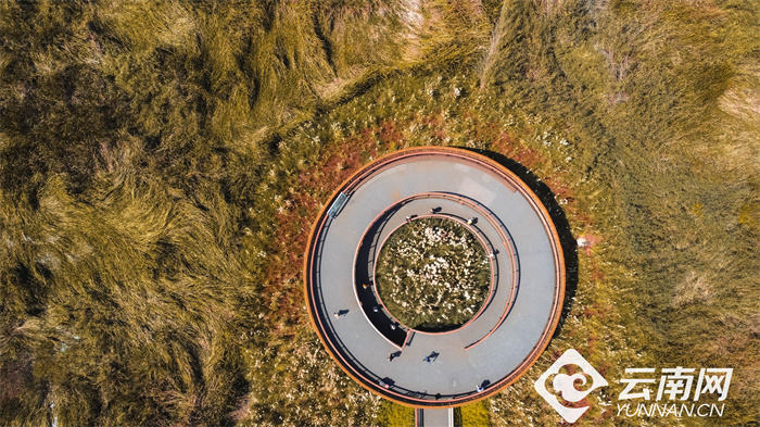 草之桥位于昆明滇池绿道中段,并非传统交通桥梁,而是沉浸式生态景观节点。记者现场探访发现,桥身红色护栏蜿蜒延伸,两侧景观形成鲜明对比:一侧是层叠绿意的原生森林,另一侧为秋日盛放的白色芦苇荡,风吹苇动间尽显自然野趣。桥体中央的圆形草编建筑是标志性景观,从空中俯瞰,螺旋形步道与草地、芦苇构成艺术画面,据了解,目前这一景点日均吸引超200名摄影爱好者前来打卡拍照。