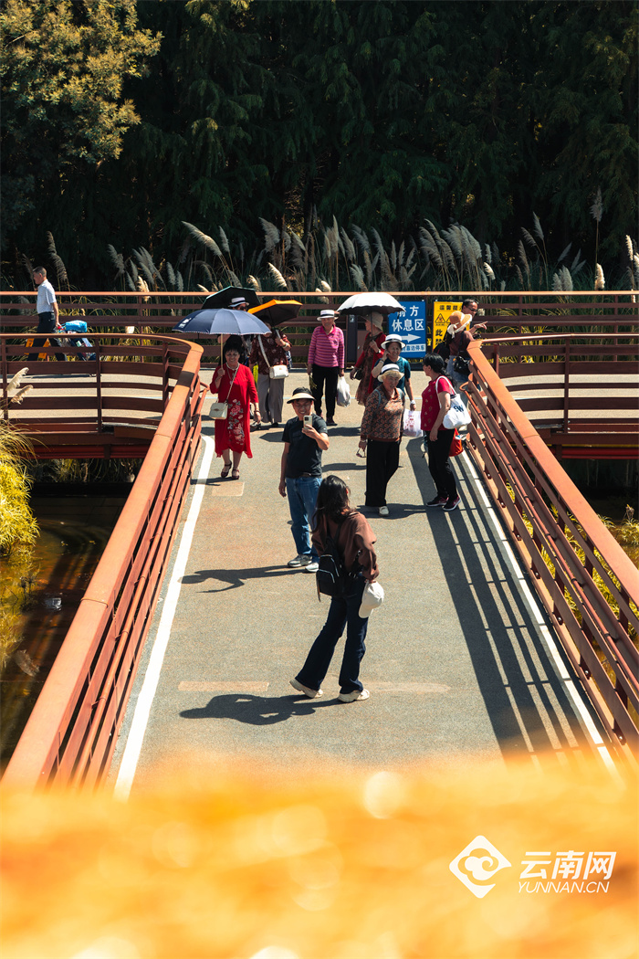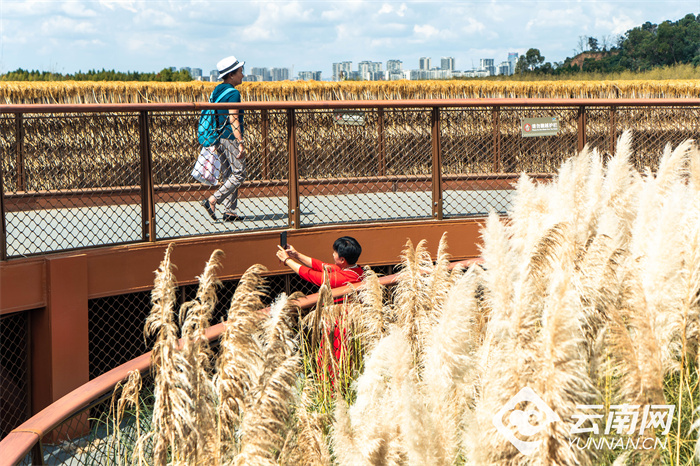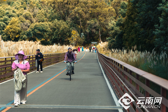 随着“双节”临近,这里的“烟火气”愈发浓厚:清晨有骑行爱好者沿绿道穿梭,午后游客或在芦苇丛前拍照,或举家漫步;绿道沿线设置20余处休憩区,配备饮水设施与生态指示牌,向游客传递滇池保护理念。