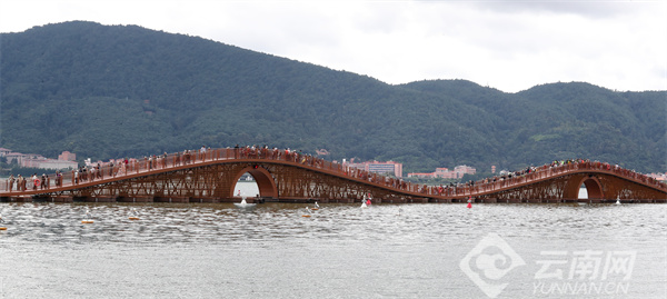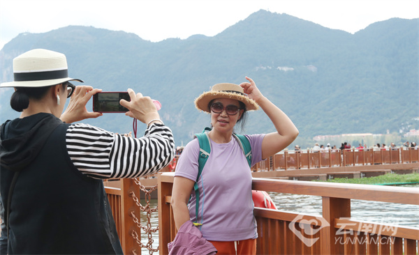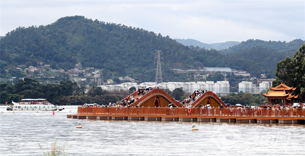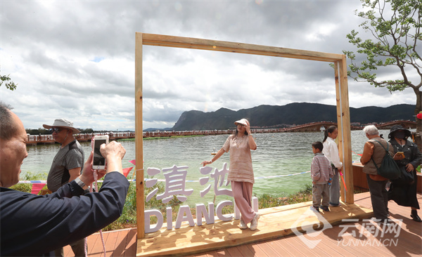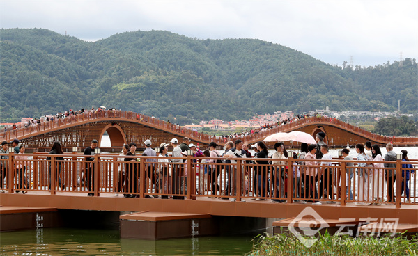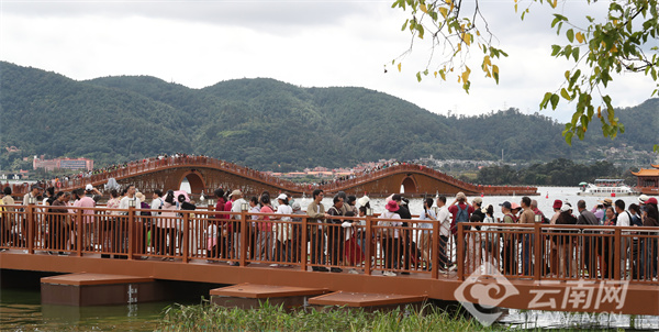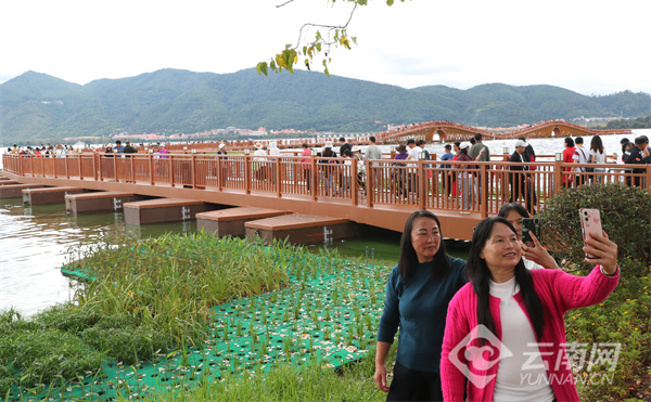 国庆中秋假期,昆明滇池绿道草海开合浮桥成为假日旅游新晋“网红打卡地”,每日上万人前来争睹514米长的“水上长虹” ,漫步浮桥观赏滇池草海景观,沉浸式体验穿行草海“水上行、画中游”的意境。