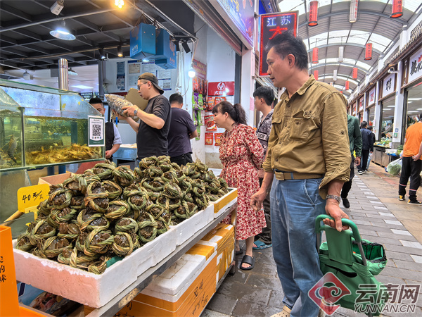 步入昆明东华农贸市场,扑面而来的是浓浓的节日气息。在水产区,大闸蟹摊位人气尤为旺盛,不少顾客围聚在摊前仔细挑选,询价声、称重声此起彼伏,不绝于耳。据摊主介绍,近期大闸蟹销量明显上升,已成为市场中的消费亮点。与此同时,水果摊位与烧腊档口前也排起了长队,新鲜的应季水果与各式特色熟食备受市民青睐,这番供销两旺的热闹景象,正是昆明城里一幅最为典型的节日民生图景。