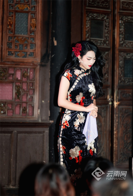 作为一部专为中秋佳节打造的特别演出,《夜夜夜歌》巧妙利用马家大院这座百年古宅的独特空间,将其精心复原为1932年昆明戏院。在前言剧社左丘编剧、演艺公司段皓楠导演的匠心打造下,演出打破了传统舞台的局限,通过多层次表演区域的精心设计,让演员在观众身边穿梭表演,实现了真正的“零距离”观演体验。
