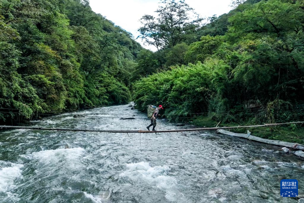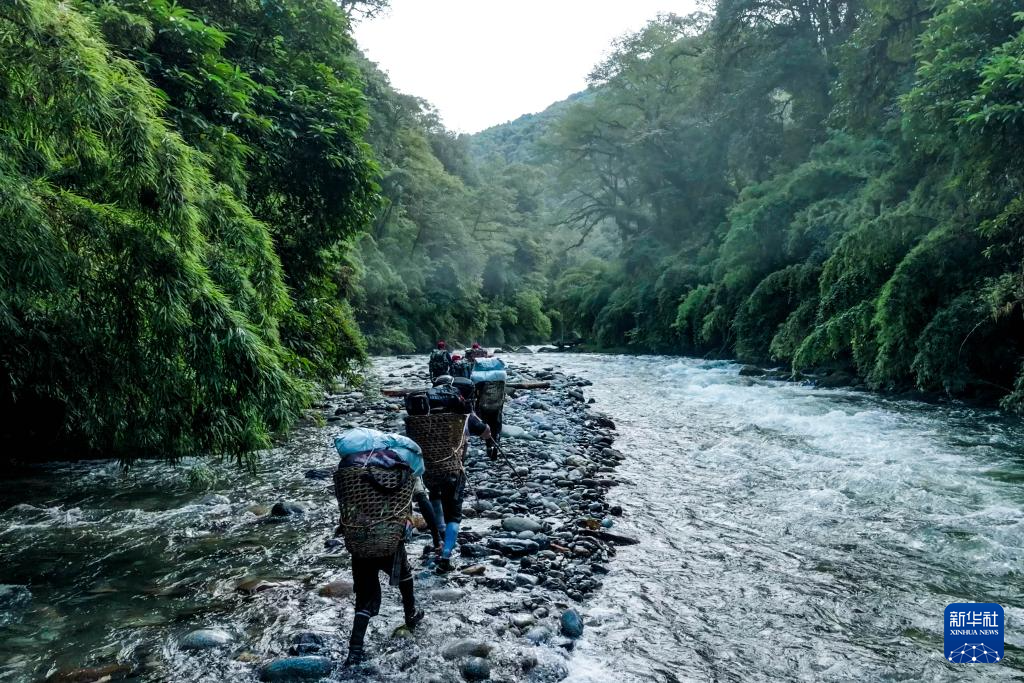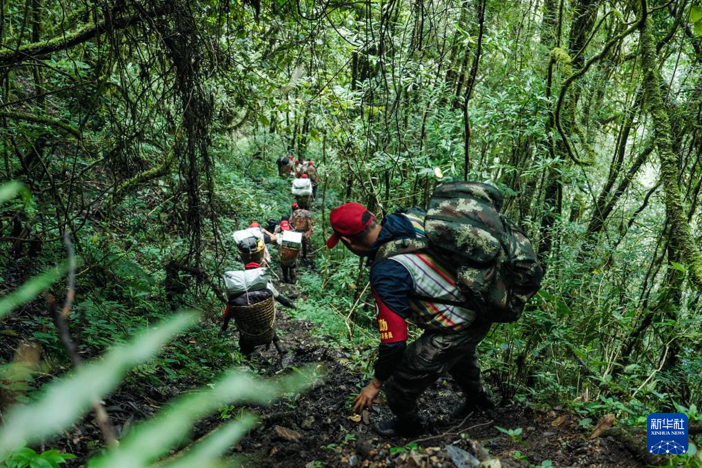 往后的路更加难走。通往山顶的路是用砍刀“劈”出来的,竹茬子断口锋利得像刀片,稍不注意就会划开皮肉。24岁的王桂明攥着背篓带子,指节泛白。这是他第一次以界务员身份巡界,竹篓里的防锈漆、水壶、简易帐篷等物品加起来重约80斤,肩带早已在肩头勒出深红色的印子。每当走不动时,他总会想起出发前,村里老人握着他的手说:“界桩是家的门,守着界桩,就是守着独龙江的每一户人。”