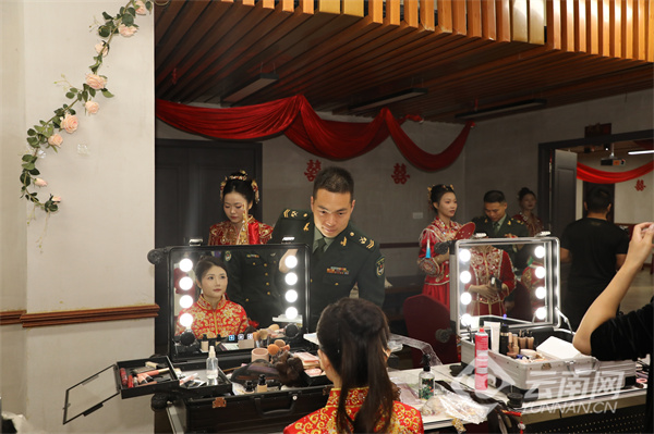 金秋时节,晨光熹微,婚礼现场的化妆间早已弥漫着甜蜜的忙碌气息。新娘们对着镜子轻点朱唇,眼眸中满是对未来的期待,每一个妆容细节里都藏着对这场边关婚礼的珍视。