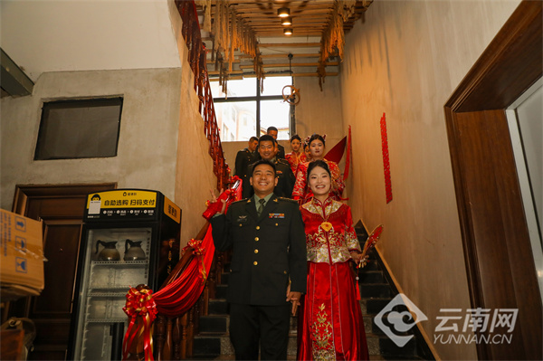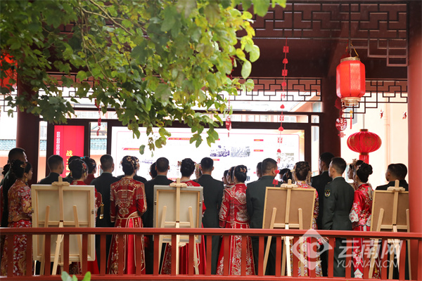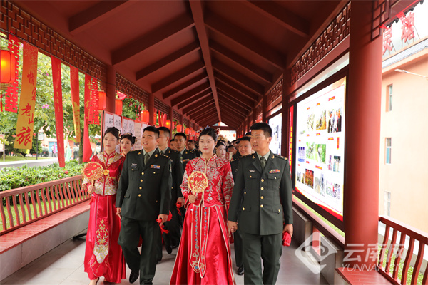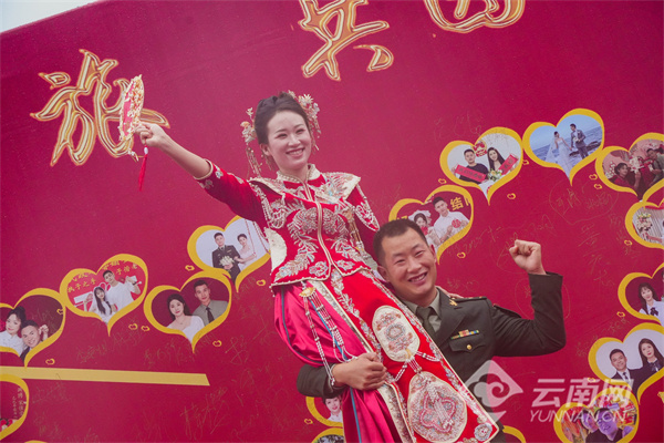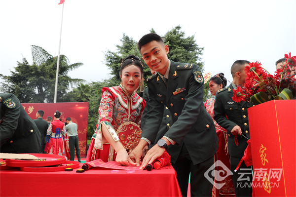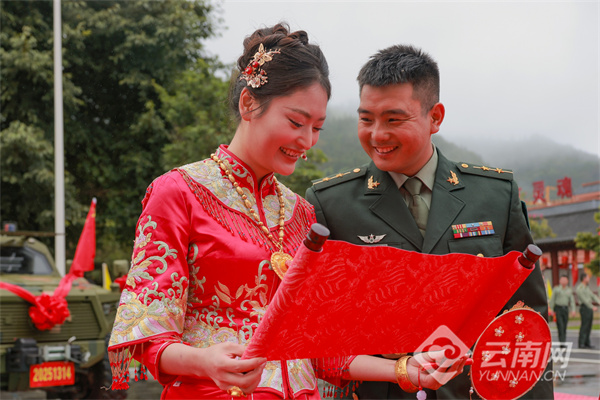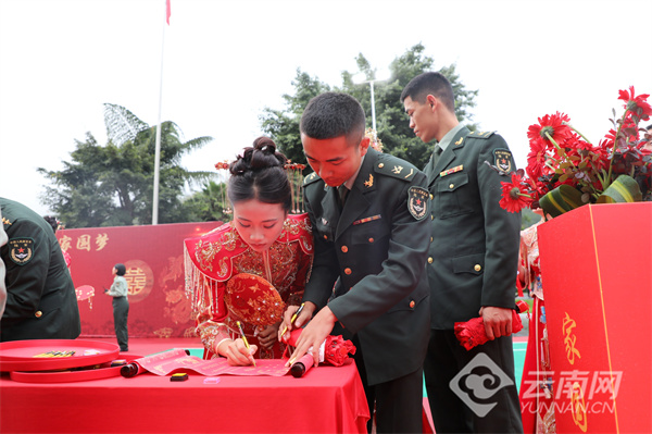 “你以忠诚戍边,我以深情候归”——在签订婚书环节,新娘挽着戎装新郎,庄重地在婚书上写下彼此的姓名。如果说军功章是官兵献给祖国的答卷,这张婚书便是新人对彼此一生的承诺。随后,新人们依次在“情定老山旅 共圆家国梦”主题墙前合影,定格幸福瞬间。