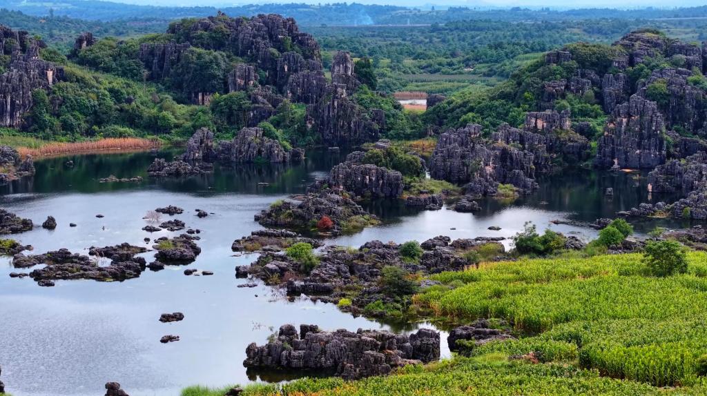 云南石林的喀斯特水上景观,是剑状喀斯特地貌与水体的罕见共生体。当雨水填满石林间的溶蚀洼地,便会形成“峰从水中出,水随峰流转”的独特景观。