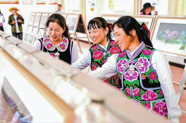 本次展览中,彝绣与鸟类元素巧妙融合成为一大亮点,绣娘们把摄影展中的鸟儿形象融入刺绣创作,以丝线为笔、布帛为纸,绣出一幅幅会飞的非遗。这不仅是艺术形式的跨界创新,更是生态保护理念在民间文化中的生动表达。
