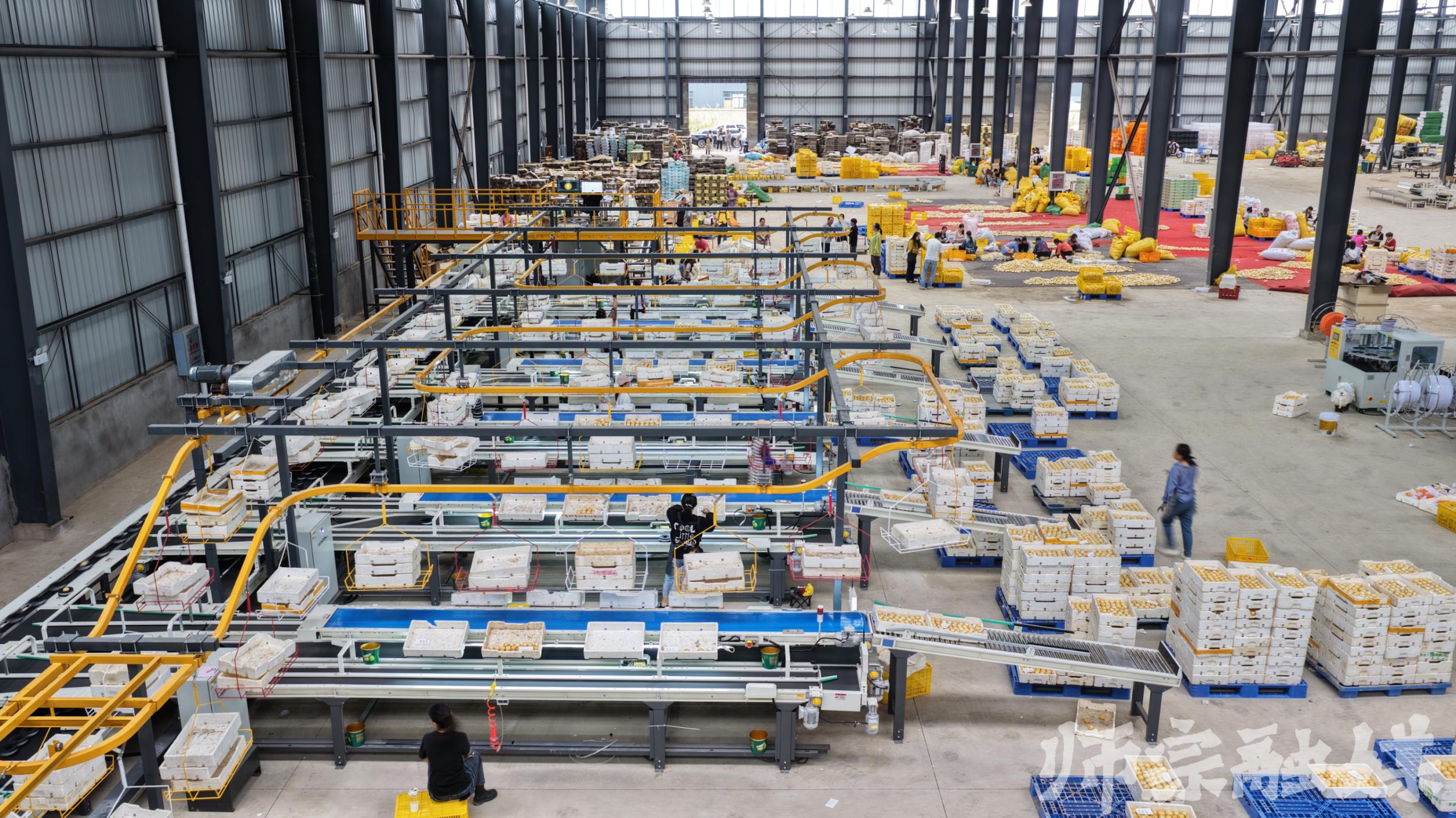 丰收的果实在最短时间汇聚到师宗工业园区的农业标准化厂房里,这个占地面积约9600平方米的厂房,覆盖了香瓜茄的储存、等级分选和分拣加工。从清洗、风干到区分果实的色泽、形状、克重、甚至甜度和黑心,都逃不过智能分拣设备的“火眼金睛”,最终经过筛选分类的果子可以在每个通道进行包装,装箱后发往全国各地。