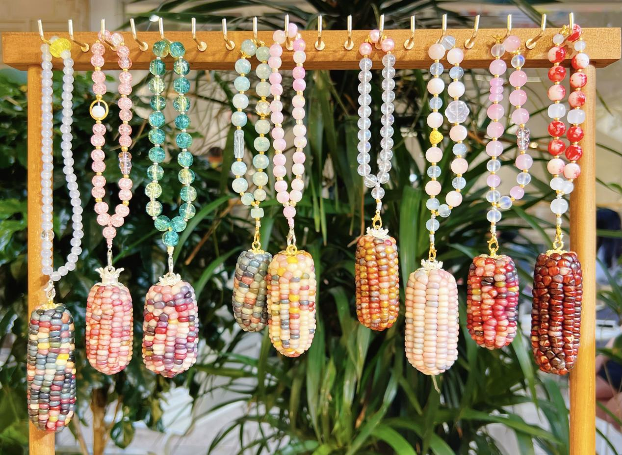 经自然晾晒、人工精选、手工创意后,高颜值的玉米迎来了“七十二变”:配上木质底座成为文玩摆件,单粒打孔辅以云南银饰变成手链、钥匙扣,挂饰、装饰画等。