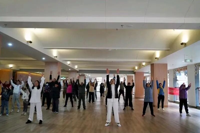 几位银发老人正跟着健康管理师舒展肢体
