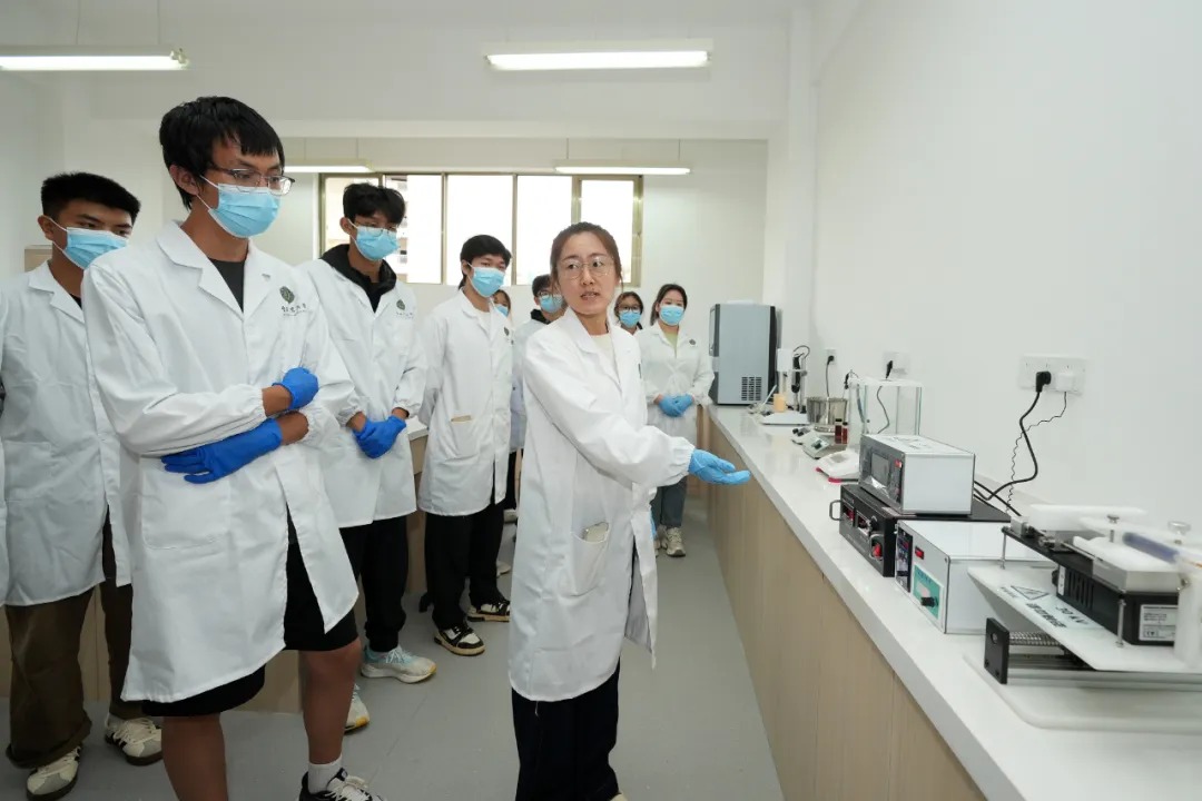 老师在茶日化实验室向学生们介绍仪器的使用方法。