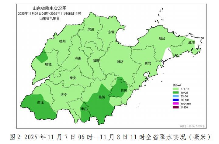 11月7日06时至8日11时,全省共有16市、119县(市、区)出现降水,平均降水量5.7,折合水量约8.9亿方。各市平均:枣庄12.5、菏泽11.0、临沂10.8、日照10.6、聊城7.6、济宁6.8、泰安6.4、济南5.9、德州5.1、淄博3.6、潍坊3.1、青岛2.7、滨州2.4、东营2.3、烟台2.1和威海0.3。县(市、区)平均降水量超过10.0的18个,5.0—10.0的45个,1.0—5.0的53个,前3位的是:临沂兰陵19.6、枣庄市区16.4和枣庄台儿庄16.2。