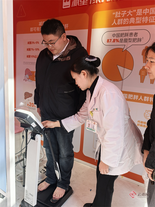 在健之佳昆明万宏路店,市民陈先生正在药师指导下接受免费体脂测试。患有脂肪肝的他,曾尝试生活方式干预但效果有限,后在医生建议下启用药物辅助减重。令他惊喜的是,药店不仅提供药物调配,还定期为他免费测量腰围、血压,并量身定制饮食与运动方案。“原本以为只是取药的地方,没想到服务这么全面。”