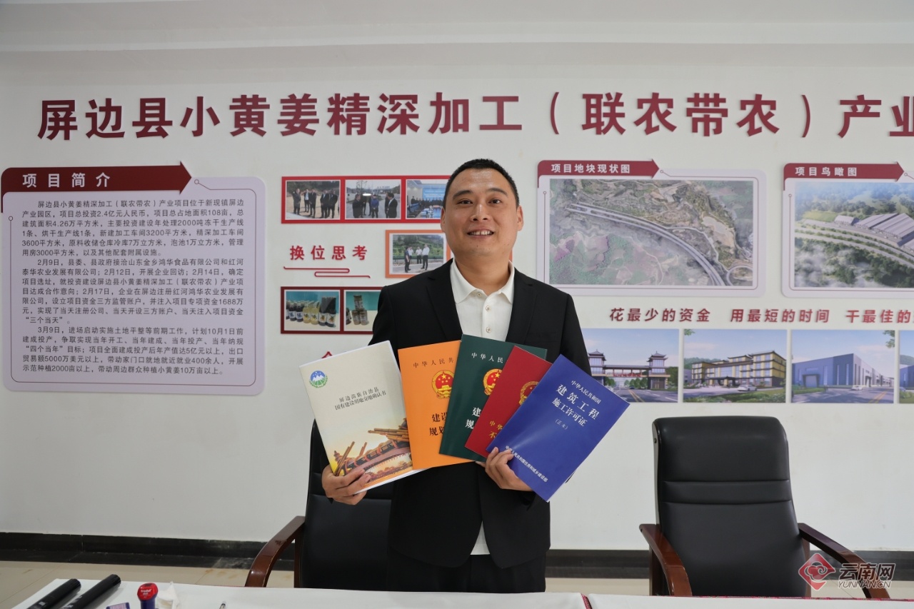 今年来,屏边县大力发展资源经济、路衍经济,引进山东金乡鸿华食品有限公司到屏边投资建设小黄姜精深加工(联农带农)产业园项目,及时组建专班服务企业、服务项目建设,坚持“政府围着企业转,企业有事马上办”,协调联动自然资源、住建、税务、政务服务等部门力量,梳理汇总项目挂牌交地、用地规划、工程规划、施工许可等六个阶段68项环节工作清单,实行挂图作战、同步交叉推进,实现了当天办理、当天颁发,让企业深切感受到云南速度、红河服务、屏边温度!