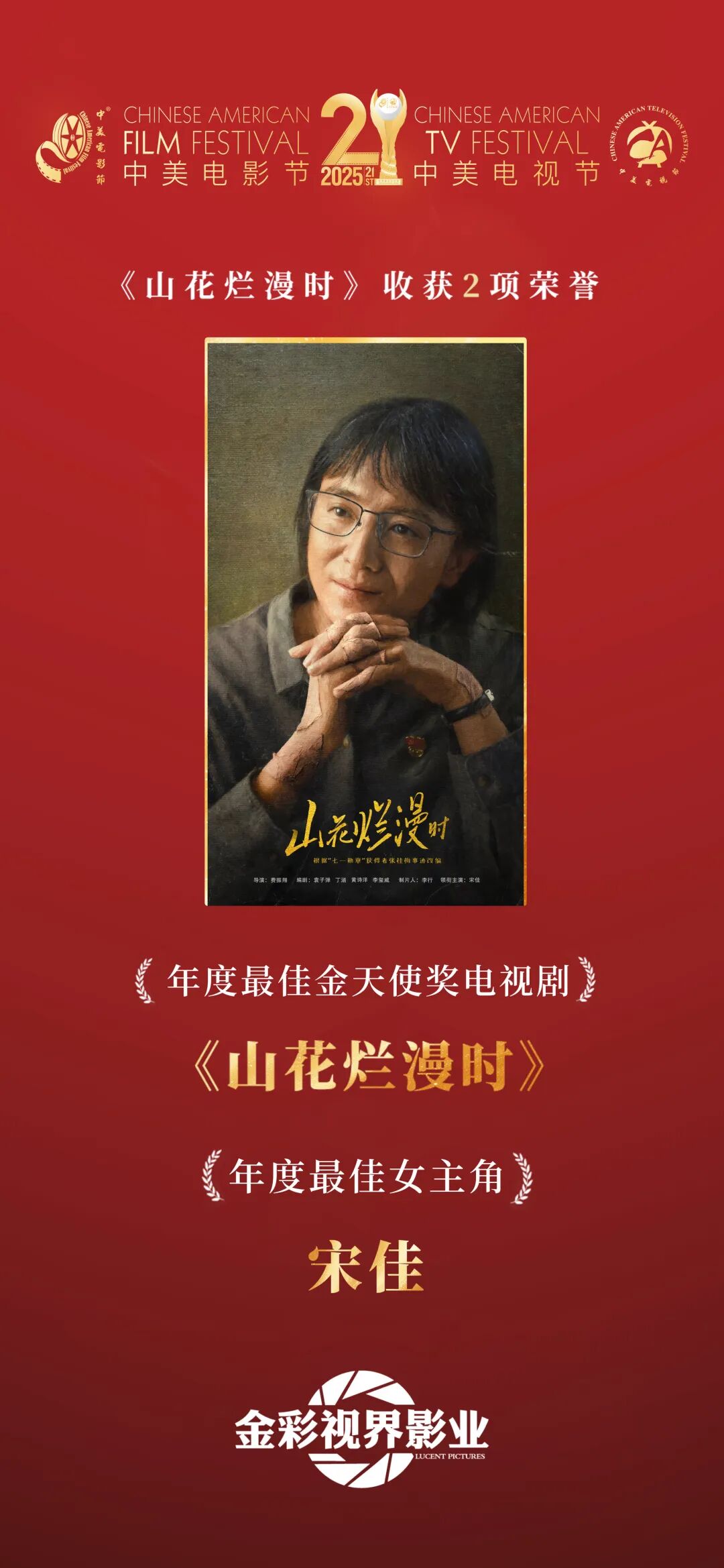 23集现实题材电视剧《山花烂漫时》以 “七一勋章” 获得者、时代楷模张桂梅的真实事迹为蓝本,通过宋佳饰演的张桂梅与师生群像,生动再现了张桂梅校长创办华坪女高,以坚韧信念克服万难、立德树人的艰辛历程,于2024年9月10日起,先后在央视一套(CCTV-1)、央视八套(CCTV-8)、北京卫视、东方卫视和腾讯视频等平台播出。CCTV-1黄金时段收视率稳居同时段第一,并以豆瓣9.6分的成绩,创下近十年国产剧最高评分纪录,成为近年来现象级主旋律佳作。此前,《山花烂漫时》已连续斩获第30届上海电视节白玉兰奖“最佳导演”“最佳女主角”、CMG中国电视剧年度盛典“年度优秀电视剧”“年度女演员”、第二届金熊猫奖“最佳剧集奖”“最佳编剧奖”等多项权威奖项。此次荣获中美电视节“金天使奖”,标志着该剧获得国际认可,成为中国现实题材影视“走出去”的一张亮眼名片。