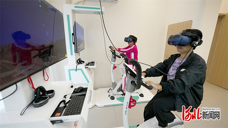 VR运动积极心理空间充满科技感与活力。袁金花戴好VR眼镜,骑上动感单车,车上的心率监测器实时显示数据,眼前则是“黄山之巅”的虚拟美景。“现在每周都来骑两次,既能锻炼身体,还能‘云旅游’,心情都变好了!”她笑着说。