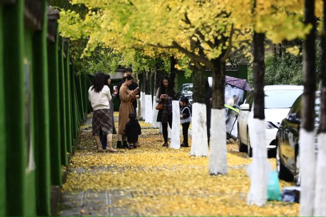 微风拂过,金黄的银杏叶在阳光下翩翩起舞,簌簌飘落的叶片宛如漫天飞舞的金色蝴蝶,传递着温暖与美好。落叶铺满路面,形成一层厚厚的“黄金地毯”,踩上去沙沙作响,成为城市里最治愈的声音。过往行人纷纷驻足,或举起手机定格美景,或在树下漫步赏叶,随手一拍都是自带滤镜的诗意画卷。