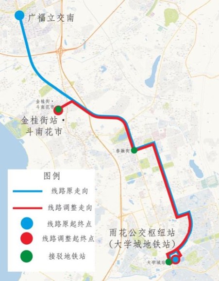 170路起终站为“雨花公交枢纽站(大学城地铁站)(始发站)——广福立交南(终到站)”,运营时间6:30——19:00。为进一步加强170路与地铁4号线金桂街·斗南花市地铁站和地铁1号线春融街地铁站的接驳换乘功能,拟将170路起终站调整为“雨花公交枢纽站(大学城地铁站)(始发站)——金桂街站·斗南花市(终到站)”。