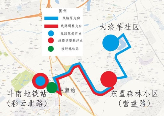 Z25路起终站为“大洛羊社区(始发站)——斗南地铁站(彩云北路)(终到站)”,运营时间7:00——18:00。为进一步加强Z25路与地铁1、4号线斗南地铁站的接驳换乘功能,拟将Z25路起终站调整为“东盟森林小区(营盘路)(始发站)——斗南地铁站(彩云北路)(终到站)”。