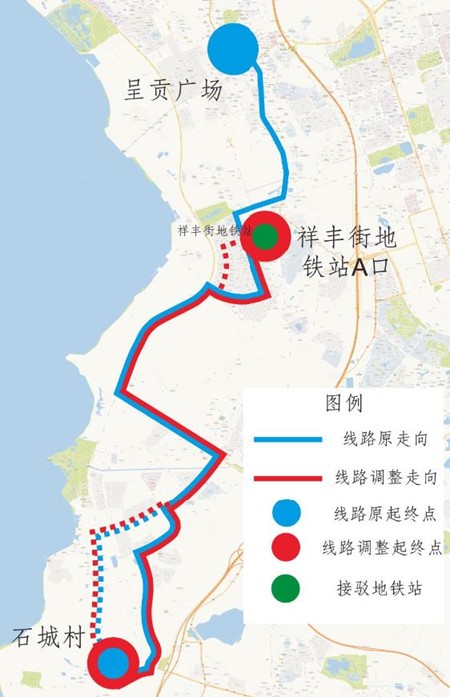 227路起终站为“呈贡广场(始发站)——石城村(终到站)”,运营时间7:00——19:00。为进一步加强227路与地铁4号线祥丰街地铁站的接驳换乘功能,拟将227路起终站调整为“祥丰街地铁站A口(始发站)——石城村(终到站)”。
