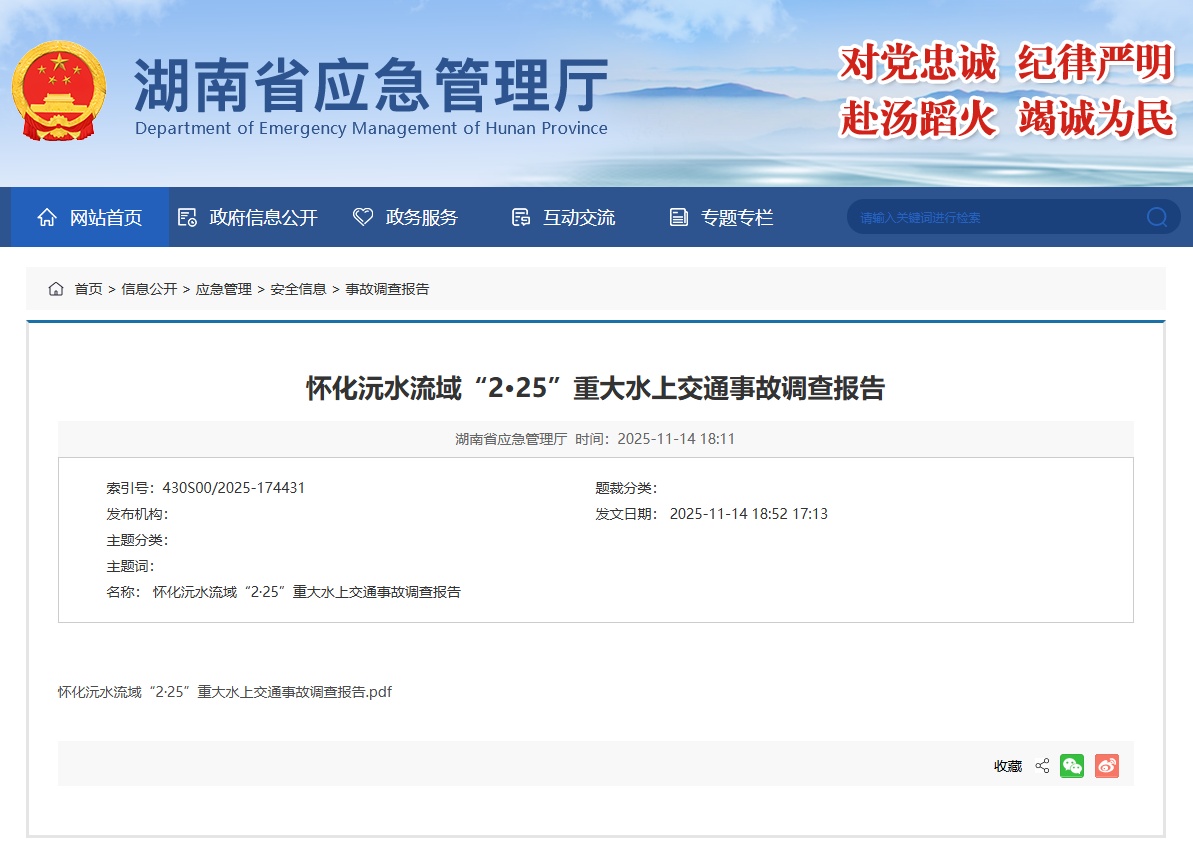 原标题:湖南怀化沅水流域“2·25”重大水上交通事故调查报告公布