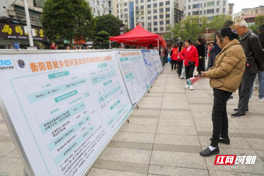 活动主办方摆放的《湖南省2025年城乡居民医保“三重保障”待遇图解》《衡阳县城乡居民基本医疗保险缴费及待遇标准》《衡阳县城乡居民基本医疗保险政策宣传》等5块医保政策宣传展板,吸引了过往市民纷纷驻足观看。