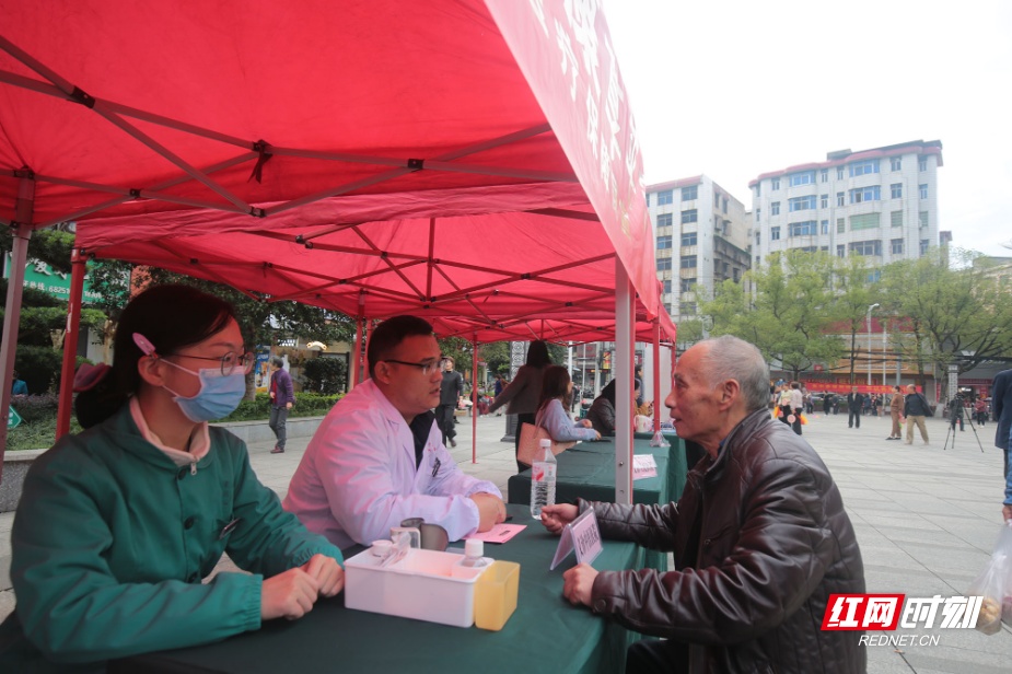 在义诊服务区,来自衡阳县人民医院、衡阳县中医院的专家,不仅免费接受过往群众健康咨询,还热情地为他们提供测血糖、量血压等便民服务,让他们足不出户就能享受到一场医疗健康服务“公益大餐”。当天,得知衡阳县举行2026年全民参保集中宣传活动,年逾七旬的西渡镇春风社区居民的陈大爷,早早就来到县中医院专家义诊台前等候。专家刚一落座,陈大爷便请他为自己看病。在仔细询问陈大爷的身体状况后,便开始为他号脉并开具处方。“感谢专家为我义诊,让我在家门口就享受到了优质的医疗服务!”接过处方后,陈大爷感激不已。
