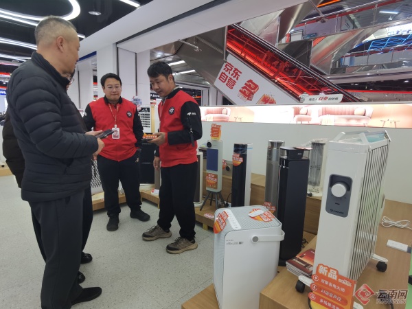 在京东电器北京路城市旗舰店,油汀、暖风器等御寒产品被集中陈列在货架醒目位置,吸引了不少市民驻足选购。