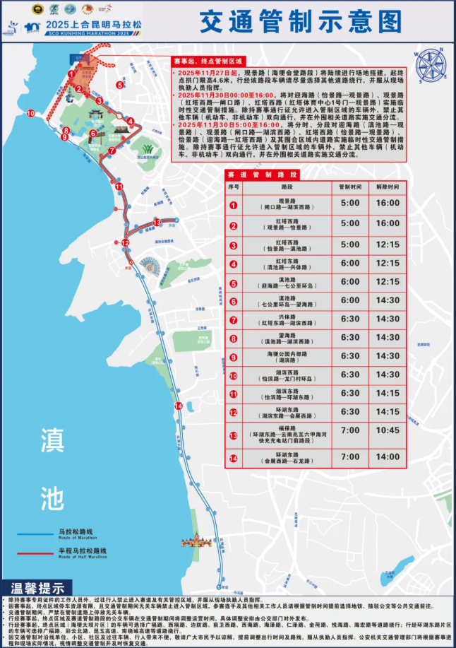 (三)2025年11月30日5:00至16:00,将分时、分段对迎海路(滇池路—观景路)、观景路(闸口路—湖滨西路)、红塔西路(怡景路—观景路)、怡景路(迎海路—红塔西路)及其围合区域内道路实施临时性交通管制措施。除持赛事通行证允许进入管制区域的车辆外,禁止其他车辆(机动车、非机动车)双向通行,并在外围相关道路实施交通分流。